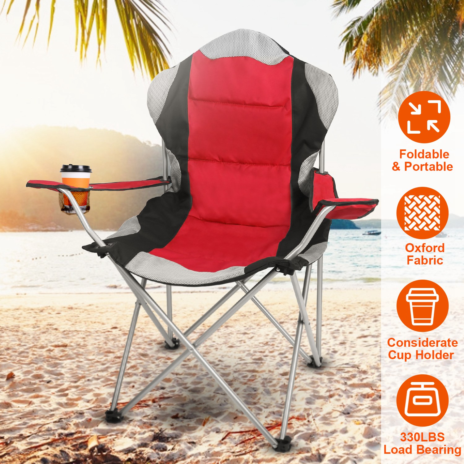 Home > Foldable Camping Chair Heavy Duty Steel Lawn Chair Padded Seat Arm Back Beach Chair 330LBS Max Load with Cup Holder Carry Bag